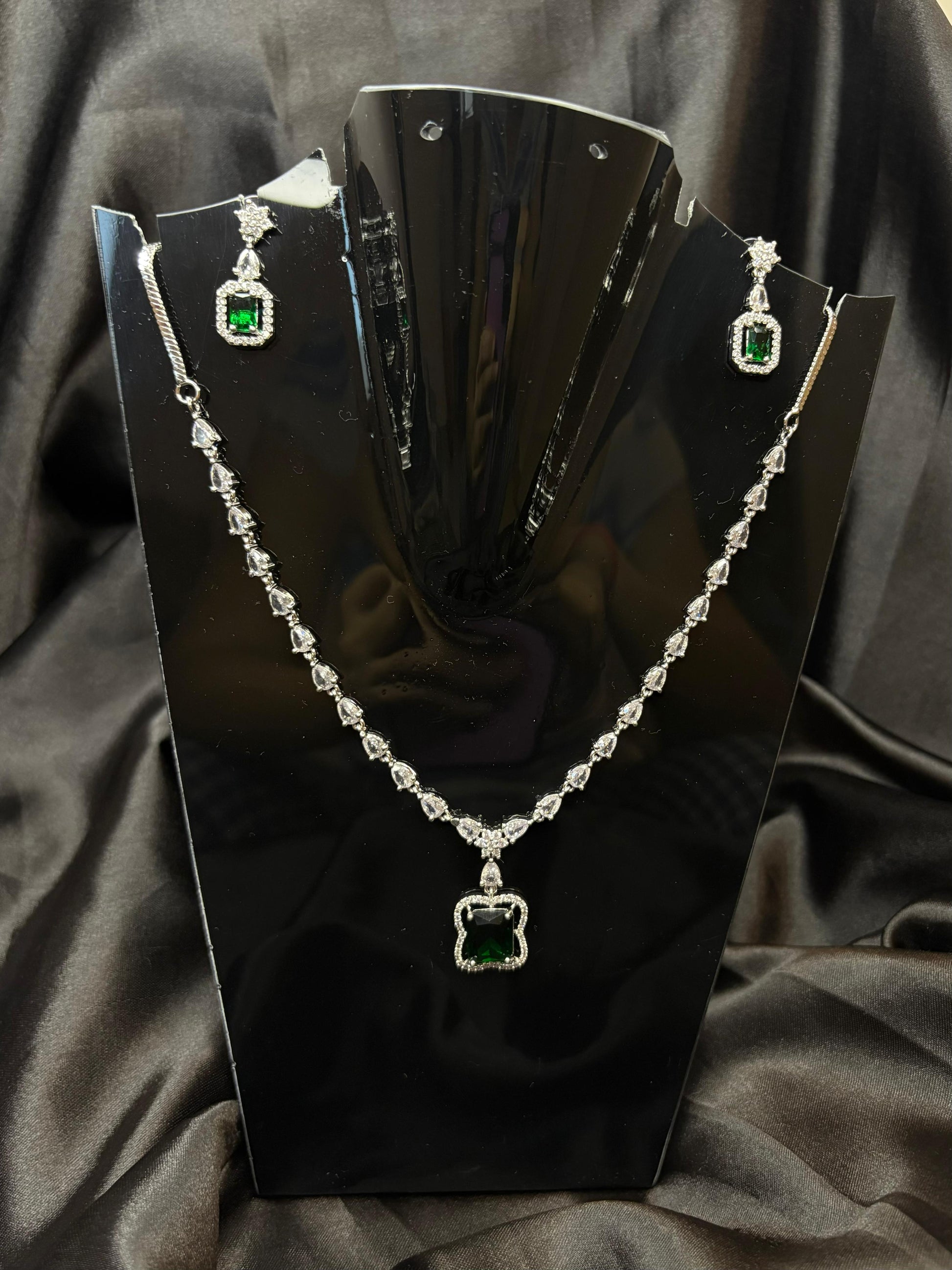 Step into elegance with our Emerald Envy Green Diamond Necklace Set โ€” a luxurious statement piece inspired by royal beauty and modern glam. This green artificial diamond set features brilliantly cut emerald-toned cubic zirconia stones that mimic the look and feel of real diamonds, giving you a regal shine without the heavy price tag.