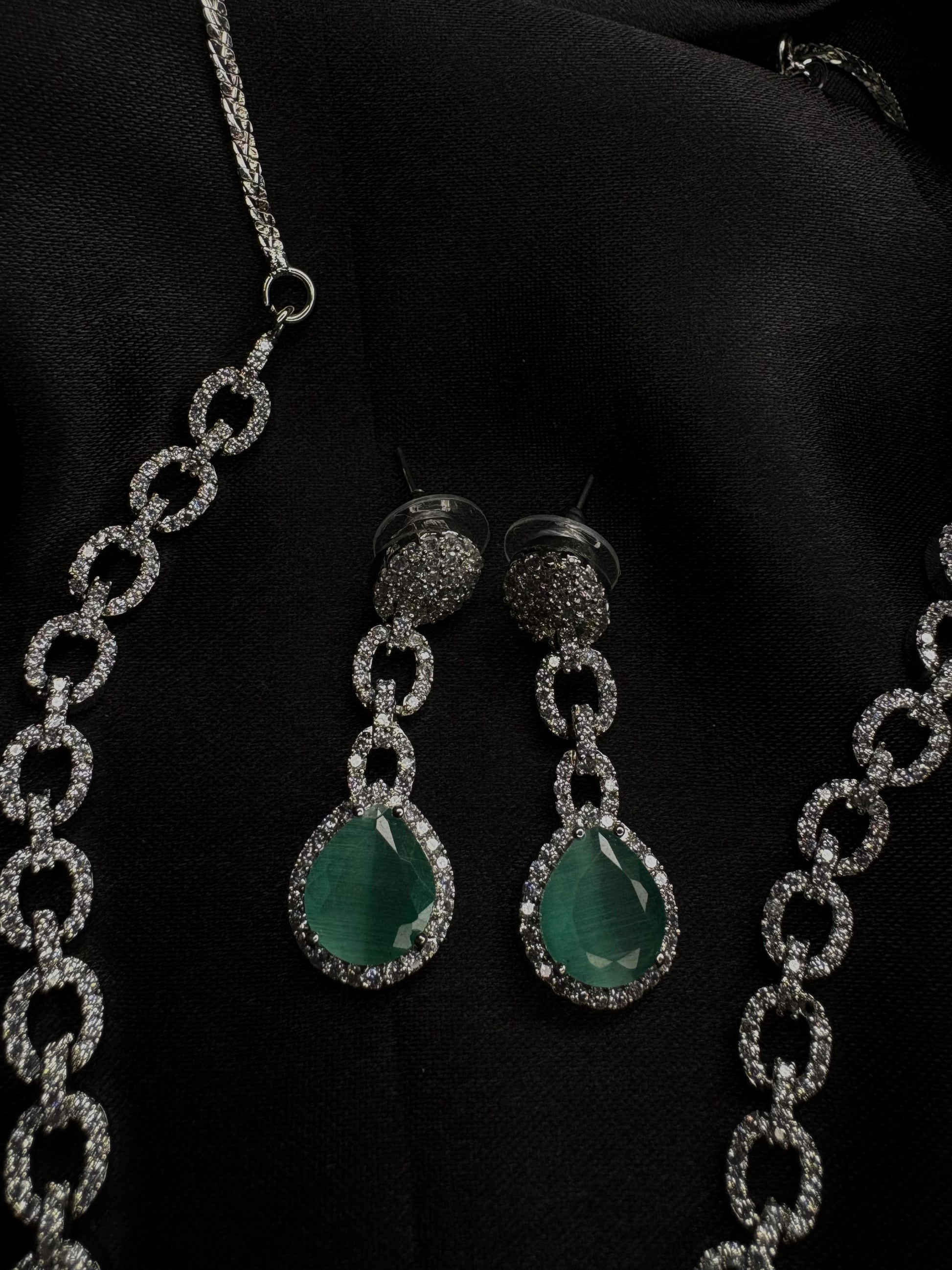 Designed for women who love to make a statement, this green artificial diamond set is ideal for weddings, receptions, festive functions, or that one unforgettable evening look.
