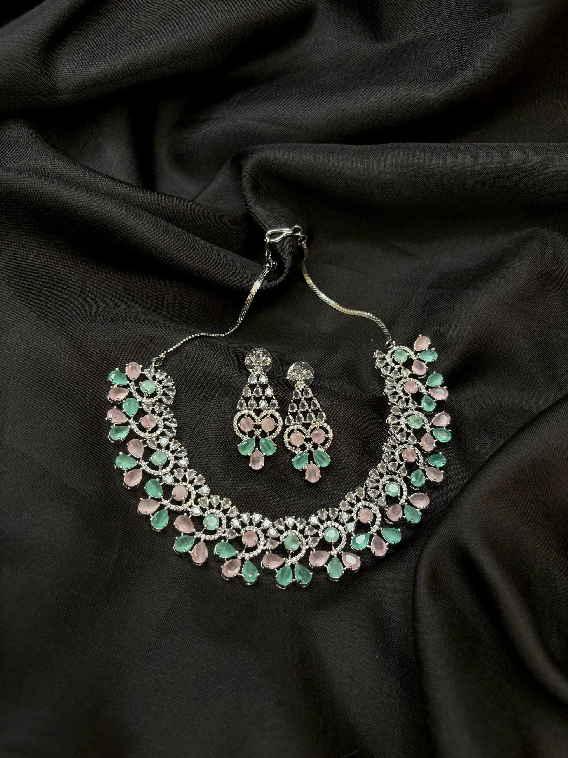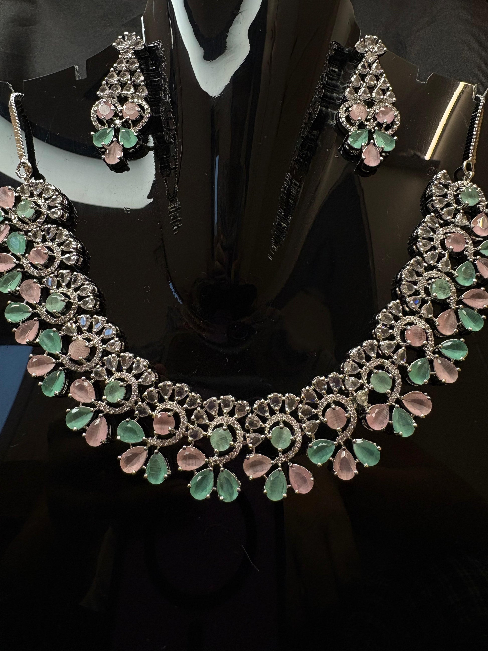 Crafted with premium-quality AAA zircon stones and finished in a delicate pastel palette, this necklace and earring combo brings a luxurious glow to every outfit — without the heavy feel or price tag of real diamonds.